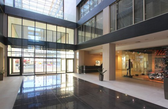 Пример брендирования входа и зоны ресепшн в бизнес-центрах: